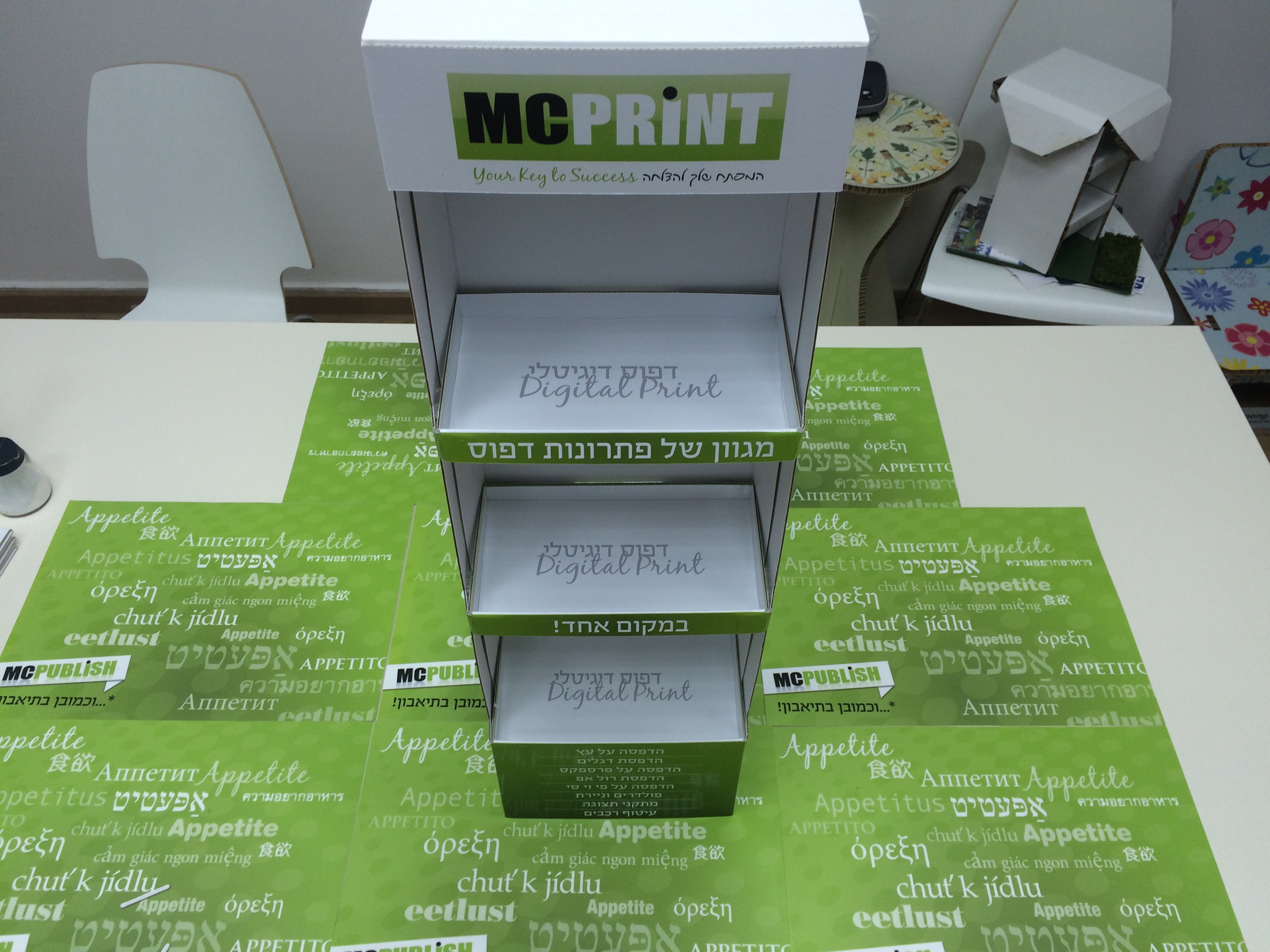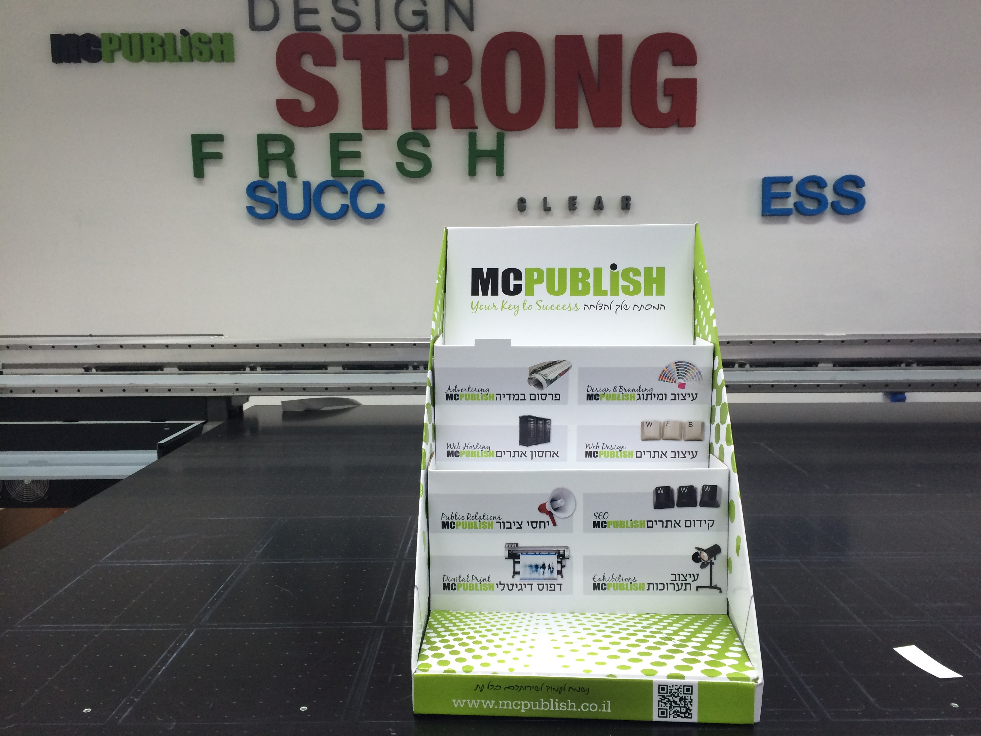 לצורך הפקת מתקני תצוגה מקרטון באיכות מושלמת אנו באם סי פרינט מלווים את המוצר כבר משלב העיצוב במחלקת העיצוב הגרפי. בית הדפוס אם סי פרינט מומחה בייצור מתקני תצוגה מקרטון: השירות כולל חיתוך קרטון באמצעות מכונות חיתוך מתקדמות, ייצור סטנדים והדפסה ישירה על גביהם באמצעות טכנולוגיות הדפסה ישירה על קשיחים בשיטת UV.