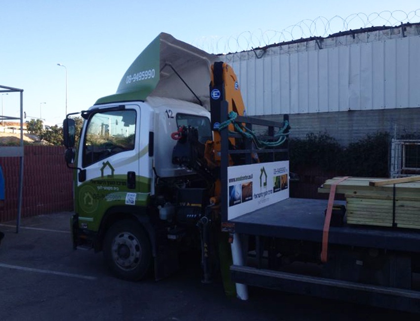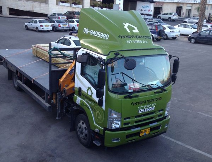 מיתוג משאית עיטוף משאיות מיתוג משאית לפי מיתוג החברה, משאית להפצת דקים, עצים, פרגולות, מרכז העץ הישראלי, עיטוף מלא של הקבינה של המשאית כולל מיתוג ארגז רוח